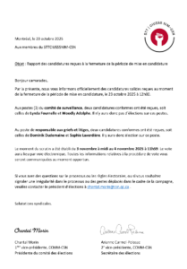 Par la présente, le comité des élections souhaite vous informer des résultats du scrutin pour le poste de responsable à l’information et la mobilisation tenu les 7 et 8 avril 2025.